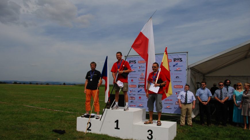Krzysiek Romicki jako jeden z trzech pilotów zdecydował się wystartować na trasę w dniu kiedy warunki były bardzo złe – silny wiatr i turbulencja – jednak wrócił cały i zdrowy. Ja początkowo mam problemy z czeską mapą i kilka tasków lecę dość słabo – jestem niezadowolony, mylą mnie ścieżki polne które na mapie są dużo szersze niż drogi szutrowe. Czwartego dnia stwierdzam że jeżeli dadzą nam jeszcze jedną trasę z mapą to się powieszę. Okazało się że do końca zawodów codziennie lataliśmy mapę, na szczęście przyszedł dobry moment i wreszcie mapa stała się jasna. Na konkurencji nawigacja po linii krzywej z deklaracją prędkości było tak jak trzeba – 970 punktów, dodam że pierwszy był Andrzej Malkusz. Moje ulubione konkurencje czyli precyzja loty na slalomach są jeszcze przed nami. Ostatnie dni i rozgrywamy pięć różnych precyzji (a już myślałem że o nich zapomniano), które po kolei wszystkie wygrywam. Dwa dni przed końcem jestem drugi, a dzień przed wskakuję na prowadzenie. Wielkie emocje zaczynają sięgać zenitu żeby tylko nic nie zepsuć. Przede mną jeszcze slalom ósemka, pomimo mego uwielbienia do latanie tego typu konkurencji wcale nie chce mi się już lecieć zwłaszcza że nie trenowałem a nawet powiem więcej nigdy nie leciałem tej „ósemki”. Pełne skupienie i wirtualne wyobrażenie lotu. Startuję , w górze w holdingu na swoją kolejkę obserwuję rywali i widzę że czołówka leci bardzo dobrze więc nie ma wyjścia muszę lecieć na maksa. Wchodzę na slalom i pierwszą ósemkę kręcę z małą asekuracją, drugą jadę na maxa. Czy to wystarczy dowiem się na dole, ale po reakcji sędziów i publiki wskazuje na sukces, aż łezka w oku się zakręciła. Jestem pierwszy. Tak więc trudna praca i wiele wyrzeczeń zostały wynagrodzone w najlepszy możliwy sposób. Do tego dokładam jeszcze rekord świata na slalomie koniczynka, jest pięknie.
