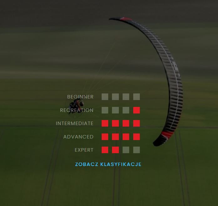 - Skrzydło ma olinowanie SL (Sheated Lines) – większość linek jest w oplocie, tylko nieliczne przy czaszy są bezoplotowe). Kolory zostały dobrane według standardów PMA.